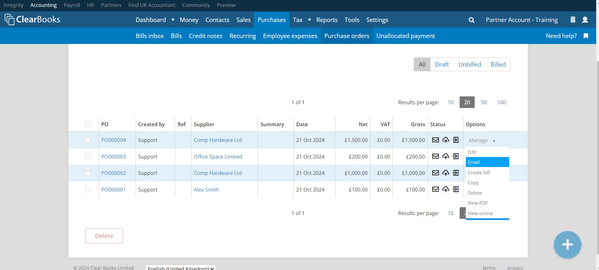 Purchase orders guide To email a purchase order, go to the ‘All’ tab to view all purchase orders.