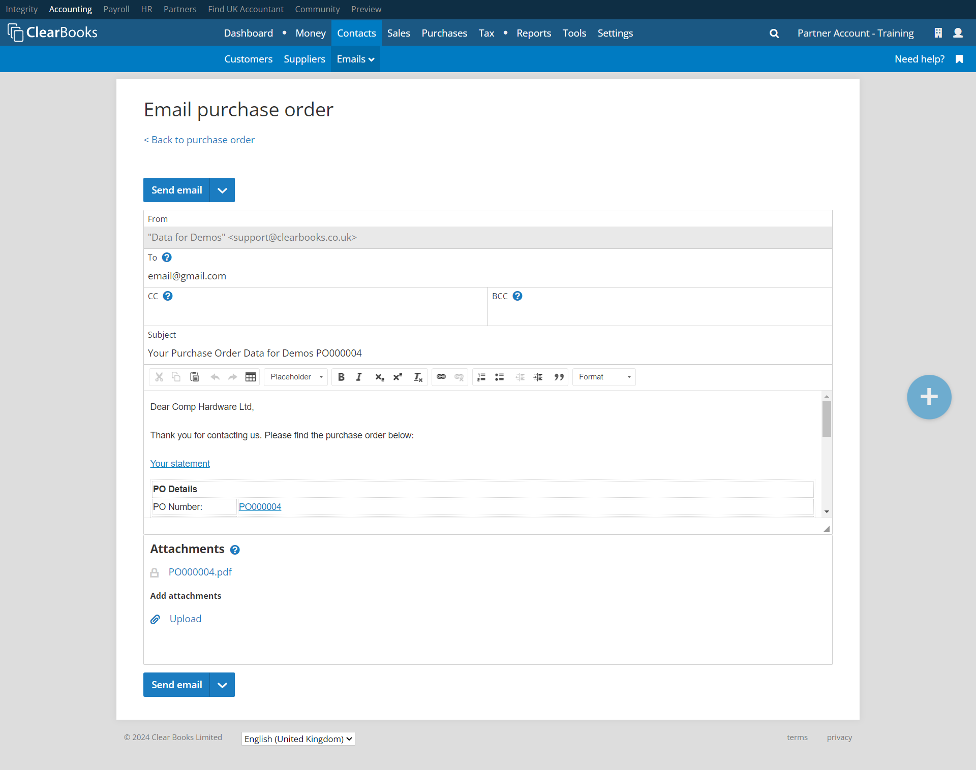 Note: If the purchase order approvals feature is enabled and the purchase order has not been approved, will not be possible to email it.