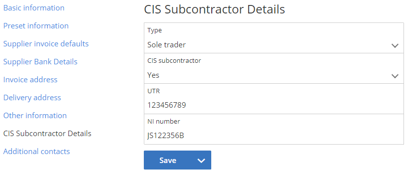 Update the CIS subcontractor drop-down box to Yes, make sure to update the Type drop-down list appropriately and fill in the other details as appropriate.