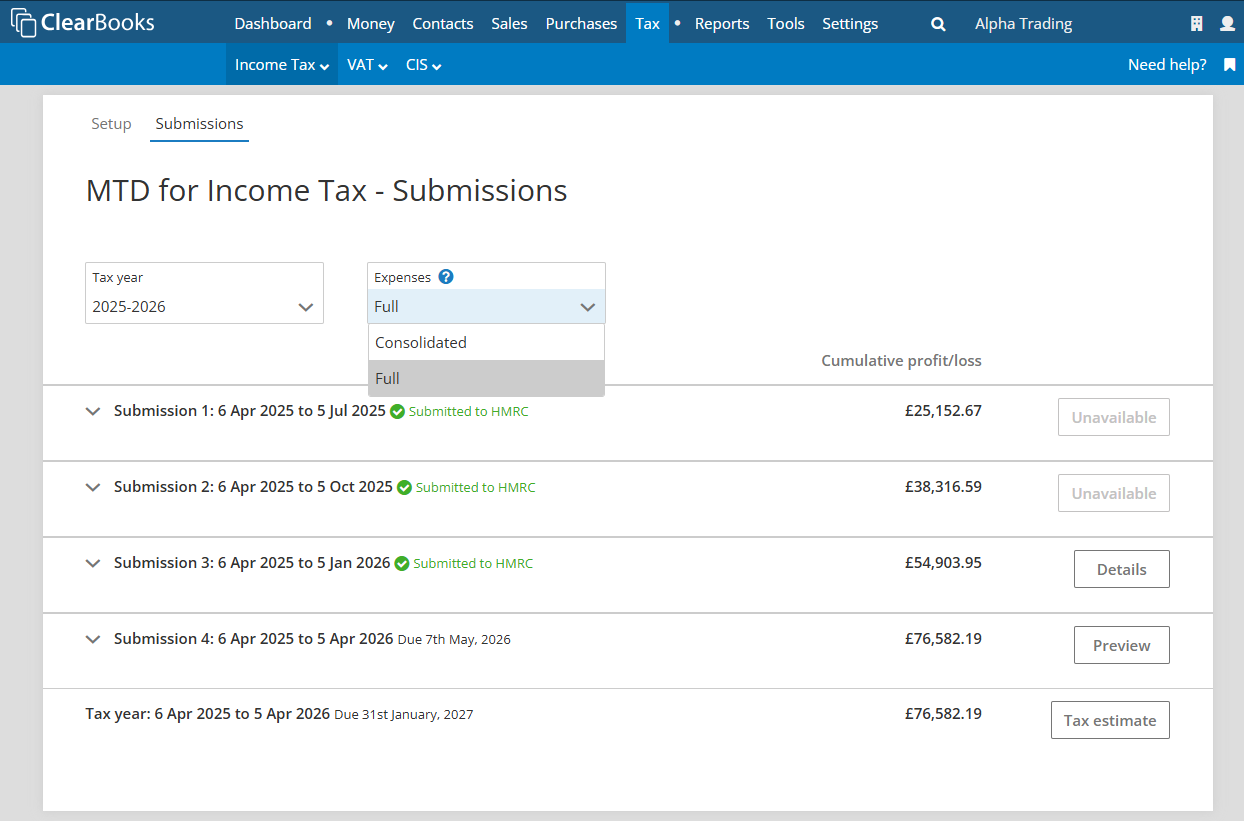 Full expenses submissions will show expenses grouped into MTD for Income Tax categories.